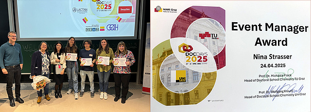 PMWS fellow Nina Strasser has been awarded together with Lena Hofbauer, Lilla Gal, Federico Rossi, und Ajza Magamadova an Event Manager Award. She and her colleagues were awarded her certificate on 25th of April for their effort to organize the Chemistry DocDays 2025. Congratulations, Nina! We are looking forward to the upcoming PMWS PhD symposium, which you are (co-)organizing!