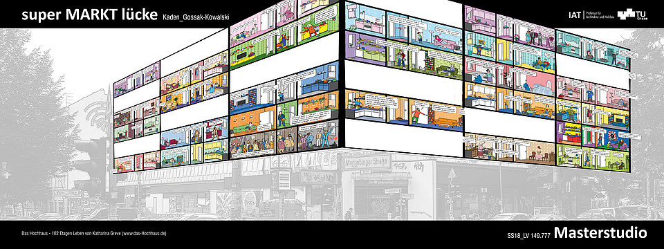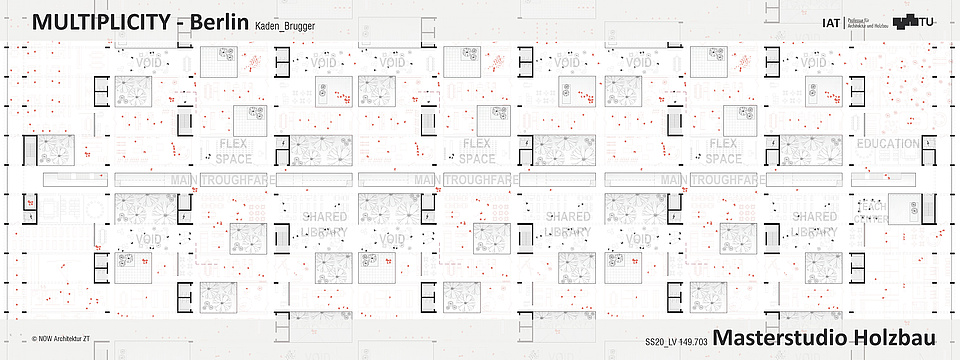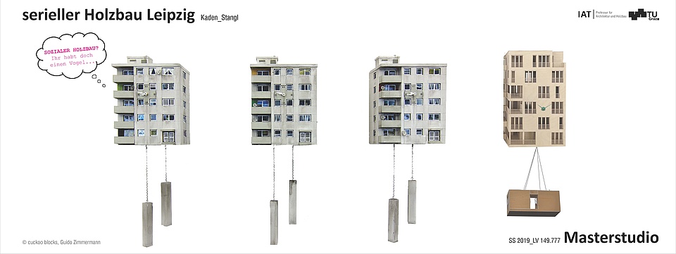 Der Typ IW-57 repräsentiert die systemische Rationalität und fungiert als Ausgangspunkt für eine neue Schichtung. Die Aufstockung des IW 57 zielt darauf ab, den bestehenden Bestand fortzuschreiben und zu erweitern. Das Ziel besteht in der Schaffung neuen Wohnraums, der in behutsamer Verschränkung mit Tragstruktur, Nutzung und dem städtischen Kontext entsteht. Im Rahmen einer detaillierten Systemanalyse erfolgt die Entwicklung von Konzepten, welche die Tragstruktur, die Bauphysik sowie die Prozessanforderungen des Holzbaus als integralen Bestandteil berücksichtigen. Holz fungiert als primäres Konstruktionsmaterial. Vom Konzept bis ins Detail werden System, Elemente und Verbindungen als Teil eines präzisen, vorgefertigten und kreislauffähigen Bauprozesses gedacht, der Effizienz, Materialbewusstsein und räumliche Qualität in ein Gleichgewicht setzt.