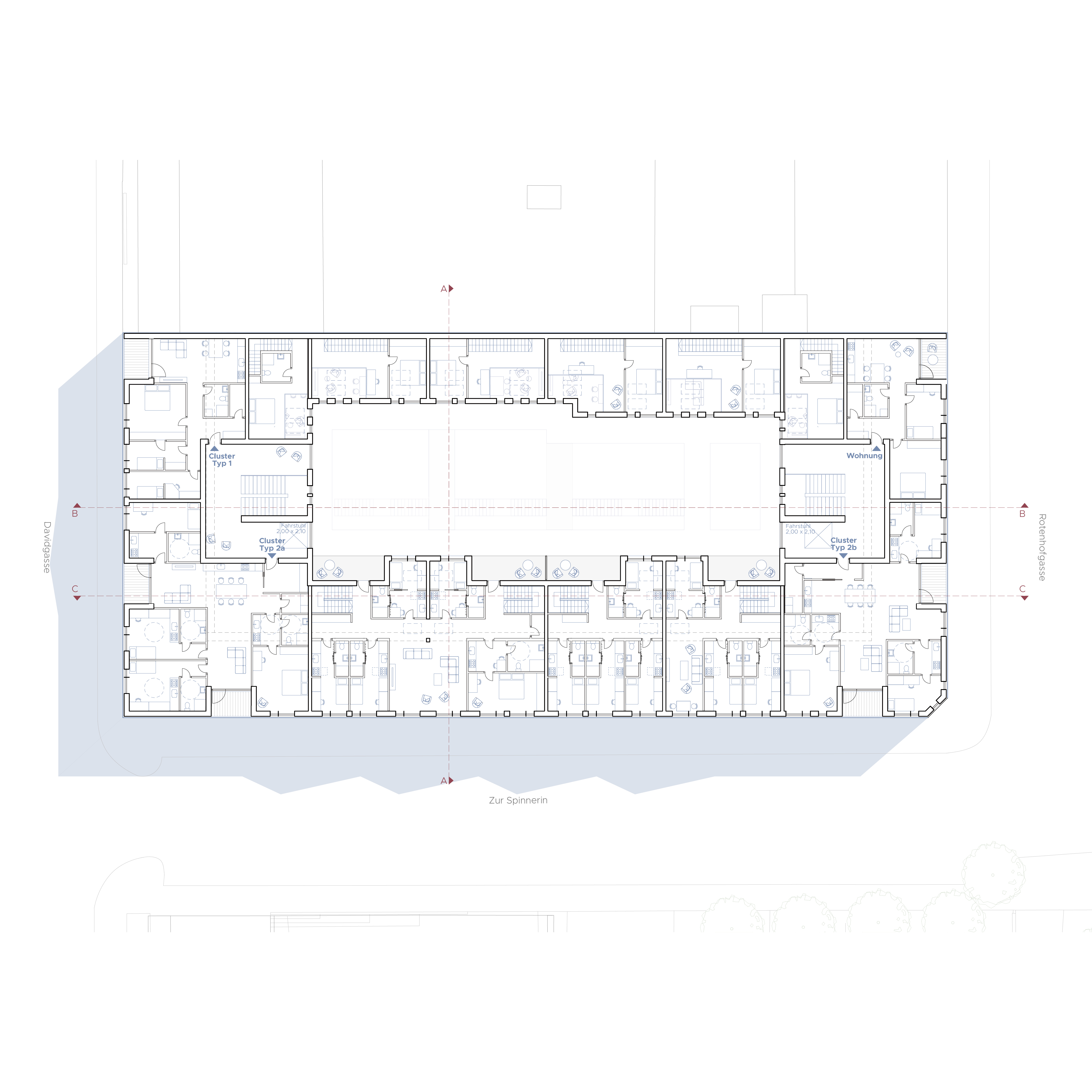 Das Thema leistbarer Wohnraum und Nachverdichtung in der Stadt wird immer bedeutsamer. Clusterwohnungen bieten hierfür einen spannenden Ansatz. Sie fördern nicht nur Begegnungen undden Austausch zwischen Bewohnern, sondern ermöglichen eine verdichtete Flächennutzung proKopf. Da das gemeinschaftliche Wohnen nicht auf alle Personengruppen ansprechend wirkt, wurden zusätzlich Single bzw. Pärchenwohnungen als Atelierwohnung entworfen. Der Innenhof wurde als Begegnungszone entworfen, welche das BFI im Bestandsgebäude mit dem Wohnen in der Aufstockung verbindet.