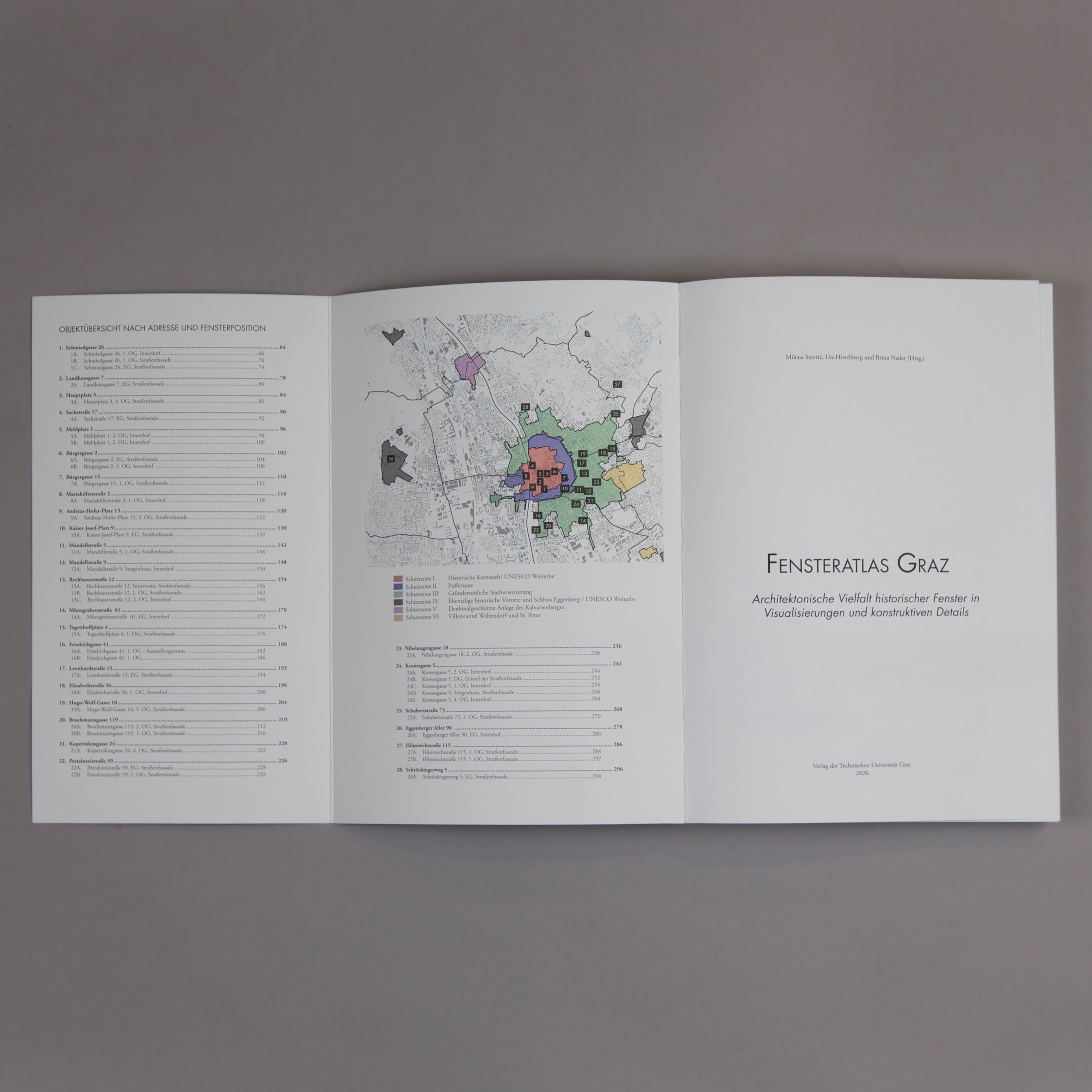The “Fensteratlas Graz” is dedicated to historic windows as defining, yet often overlooked, elements of Graz’s urban landscape. Using digital methods and detailed 3D models, the atlas makes their formal, structural, and atmospheric diversity visible. The publication documents selected historic windows and illustrates their significance as essential components of cultural heritage. The project was developed as part of the course “Digitale Darstellungsmethoden” at the Institute of Architecture and Media at Graz University of Technology and was made possible through cooperation with the Internationale Städteforum Graz (ISG). The atlas addresses both a professional audience and the broader public, inviting readers to rediscover Graz with a sharpened focus on its windows. Another volume is devoted to doors in the urban space of Graz.