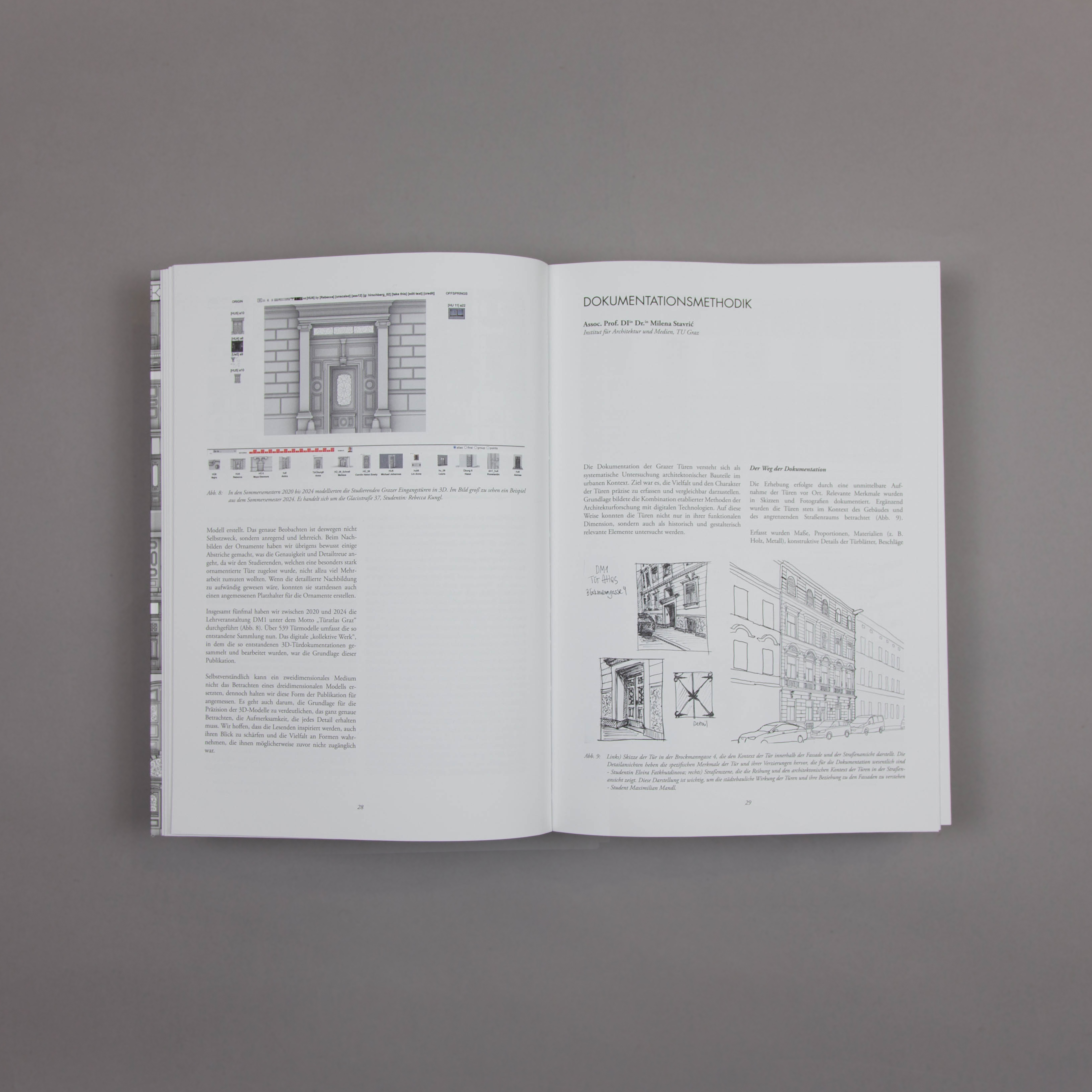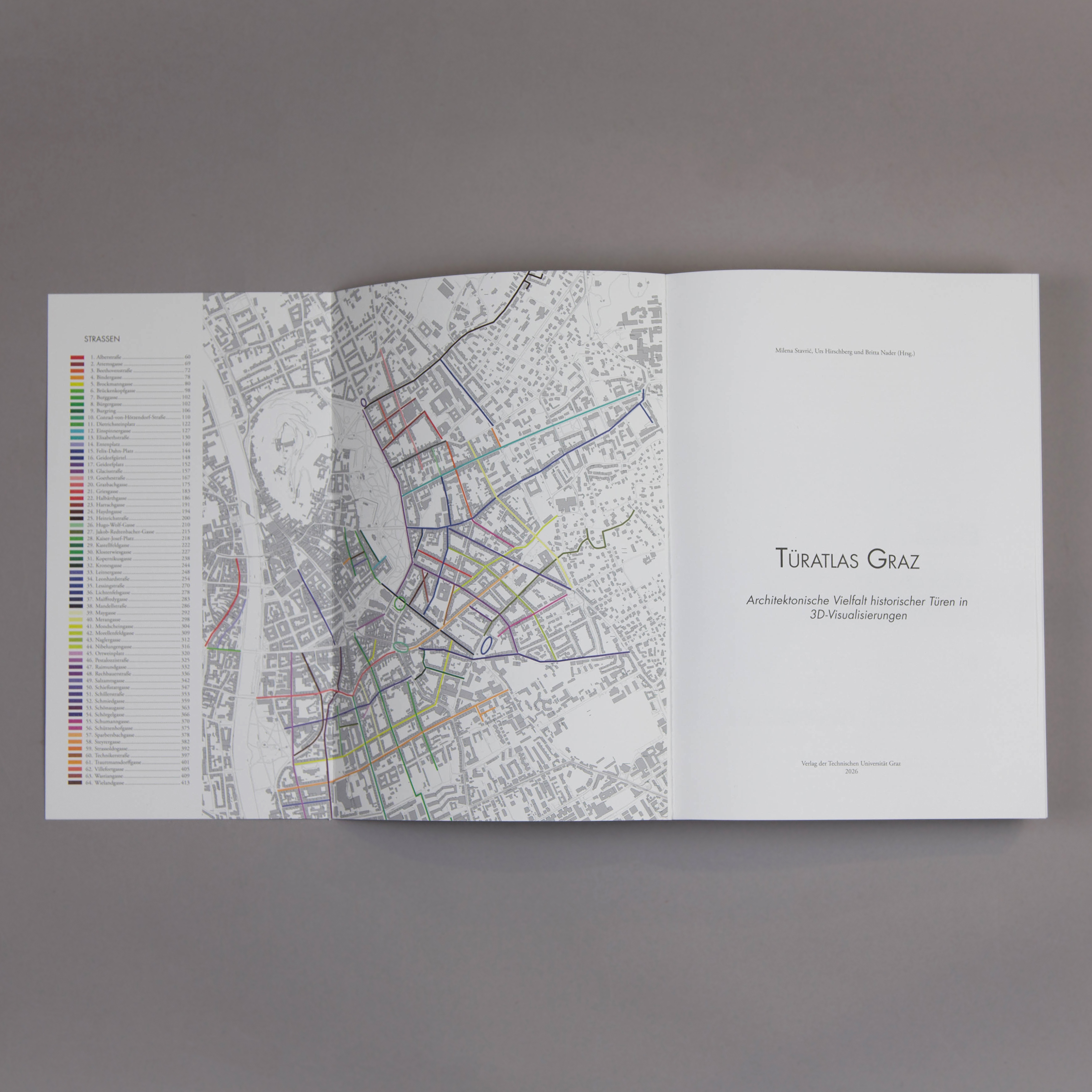 The “Türatlas Graz” is dedicated to historic doors as formative yet often overlooked elements of Graz’s urban landscape. Using digital methods and detailed 3D models, the atlas makes their design, construction, and atmospheric diversity visible. The publication brings together 539 doors and offers a differentiated perspective on their aesthetic, craft, and urban design qualities. The project was developed as part of the course “Digitale Darstellungsmethoden” at the Institute of Architecture and Media at TU Graz and was made possible through cooperation with the Internationale Städteforum Graz (ISG). The atlas addresses both a professional audience and the broader public, inviting readers to rediscover Graz with a sharpened awareness of its doors. Another volume is devoted to windows in the urban space of Graz.