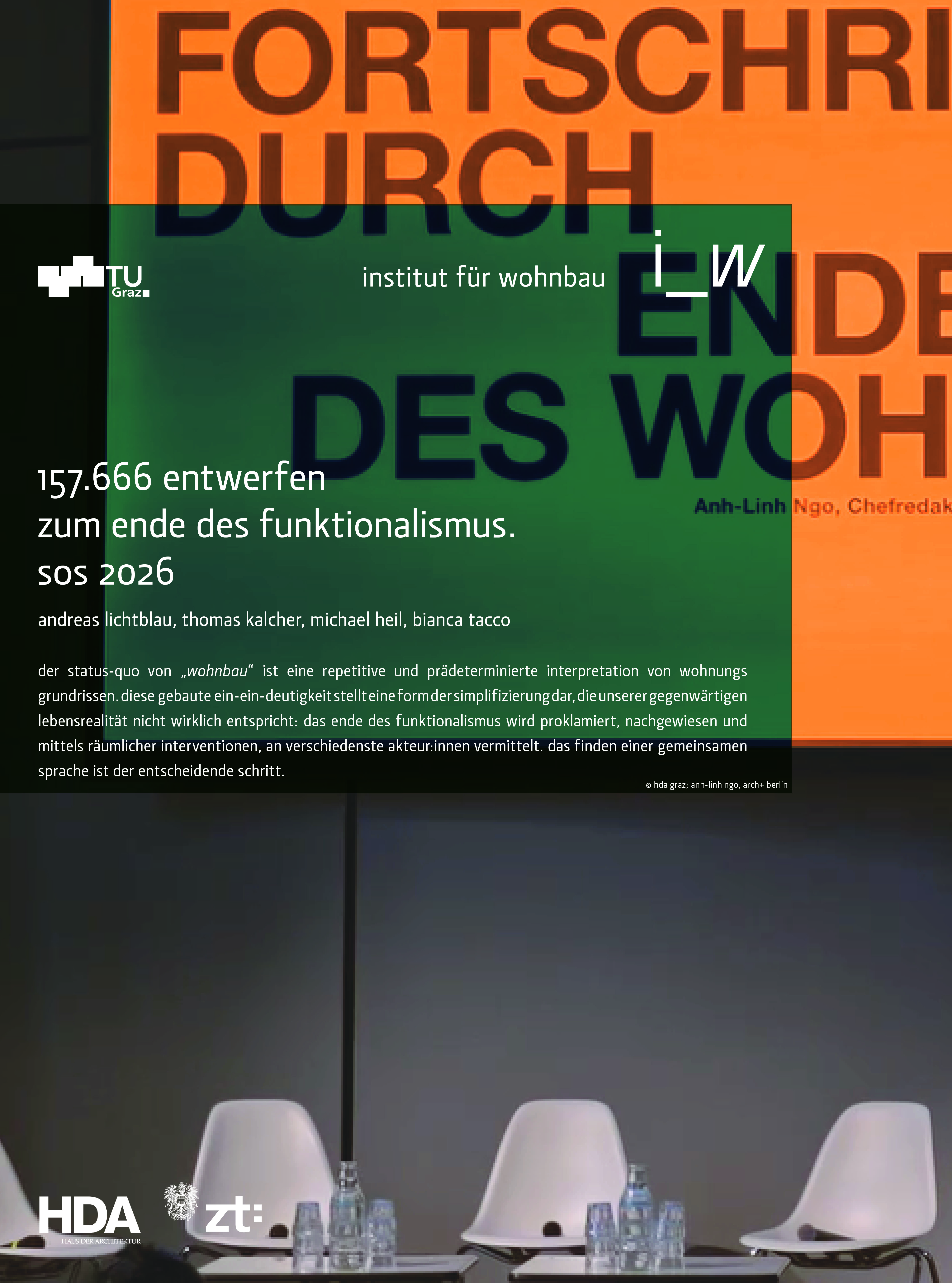 Wir plädieren für ein Ende der monofunktionalen Typologie des Wohnens und beschäftigen uns mit dem Entwickeln einer Gegenposition zu aktuellen Entscheidungsmustern. Wir überprüfen die festgefahrenen Maximen des Funktionalismus auf ihre gegenwärtige Gleichgültigkeit. Anhand von literarischen Texten, gebauten Beispielen, kulturanthropologischen und sozialräumlichen Beobachtungen, legistischen Formulierungen und quantifizierbaren Größen werden Spannungsfelder erzeugt und notwendige Handlungsspielräume aufgezeigt, die als Basis für ein Skizzieren einer neuen Programmatik des Wohnbaus notwendig sind. Neben präzisen Beobachtungen und Formulierungen stellt die entsprechende Vermittlung dieser ein wesentliches Merkmal zukünftiger Aufgabenfelder von Architekt*innen dar. Das Ende des Funktionalismus wird proklamiert, nachgewiesen und mittels räumlicher Interventionen an verschiedenste Akteur*innen vermittelt. Das Finden einer gemeinsamen Sprache ist der entscheidende Schritt.