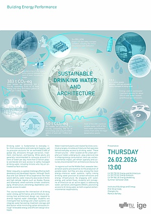 This course explores the intersection of drinking water, energy performance, and architecture, examining how architectural design can respond to diverse regional water challenges. Students will investigate how buildings and urban systems can integrate water harvesting, treatment, storage, and distribution while minimizing carbon emissions through renewable energy and efficient design strategies. By engaging with water, energy, and carbon flows, students will reimagine architecture as an active agent in addressing water, sanitation, and hygiene (WASH), positioning access to drinking water as both a spatial and environmental responsibility.