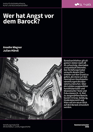 Barockarchitektur gilt allgemein immer noch oft als schwülstig, überladen und politisch inkorrekt. Das Vertiefungsmodul versucht diesen (Vor-)Urteilen auf den Grund zu gehen, die meist auf den normativen Geschmacksvorstellungen des Klassizismus beruhen. Über die Lektüre ausgewählter kunsthistorischer und theoretischer Texte und Exkursionen (4.–8. Mai) zu ausgewählten Barockbauten in Graz, Salzburg, Niederösterreich und Wien soll ein neuer Blick auf den Barock entwickelt werden.