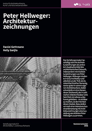 Das Vertiefungsmodul beschäftigt sich mit Architekturzeichnungen als zentralem Ausdrucksmittel des architektonischen Entwurfs, insbesondere mit Architekturzeichnungen von Peter Hellweger. Hellweger studierte in Graz Architektur und arbeitete an der TU Graz als Assistent bei Günther Domenig, sowie später in seinem eigenen Architekturbüro. Dabei entwickelte er einen besonderen Zeichenstil, der in zahlreichen Arbeiten fassbar wird. Sein Werk ist nahezu unbekannt geblieben – es sichtbar zu machen, ist die Intention dieses Moduls. Dazu stellen wir nach einer intensiven Auseinandersetzung mit Architekturzeichnungen eine Ausstellung von Arbeiten Peter Hellwegers zusammen.