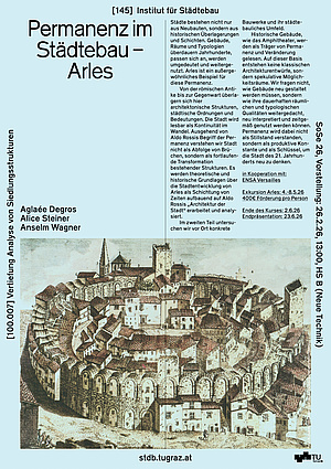 Von der römischen Antike bis zur Gegenwart überlagern sich hier architektonische Strukturen, städtische Ordnungen und Bedeutungen. Die Stadt wird lesbar als Kontinuität im Wandel. Ausgehend von Aldo Rossis Begriff der Permanenz verstehen wir Stadt nicht als Abfolge von Brüchen, sondern als fortlaufende Transformation bestehender Strukturen. Es werden theoretische und historische Grundlagen über die Stadtentwicklung von Arles als Schichtung von Zeiten aufbauend auf Aldo Rossis „Architektur der Stadt“ erarbeitet und analysiert.