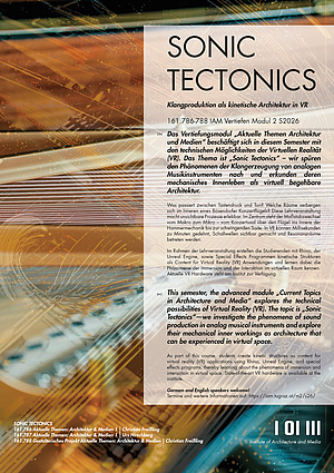 This semester, the advanced module „Current Topics in Architecture and Media“ explores the technical possibilities of Virtual Reality (VR). The topic is „Sonic Tectonics“—we investigate the phenomena of sound production in analog musical instruments and explore their mechanical inner workings as architecture that can be experienced in virtual space.