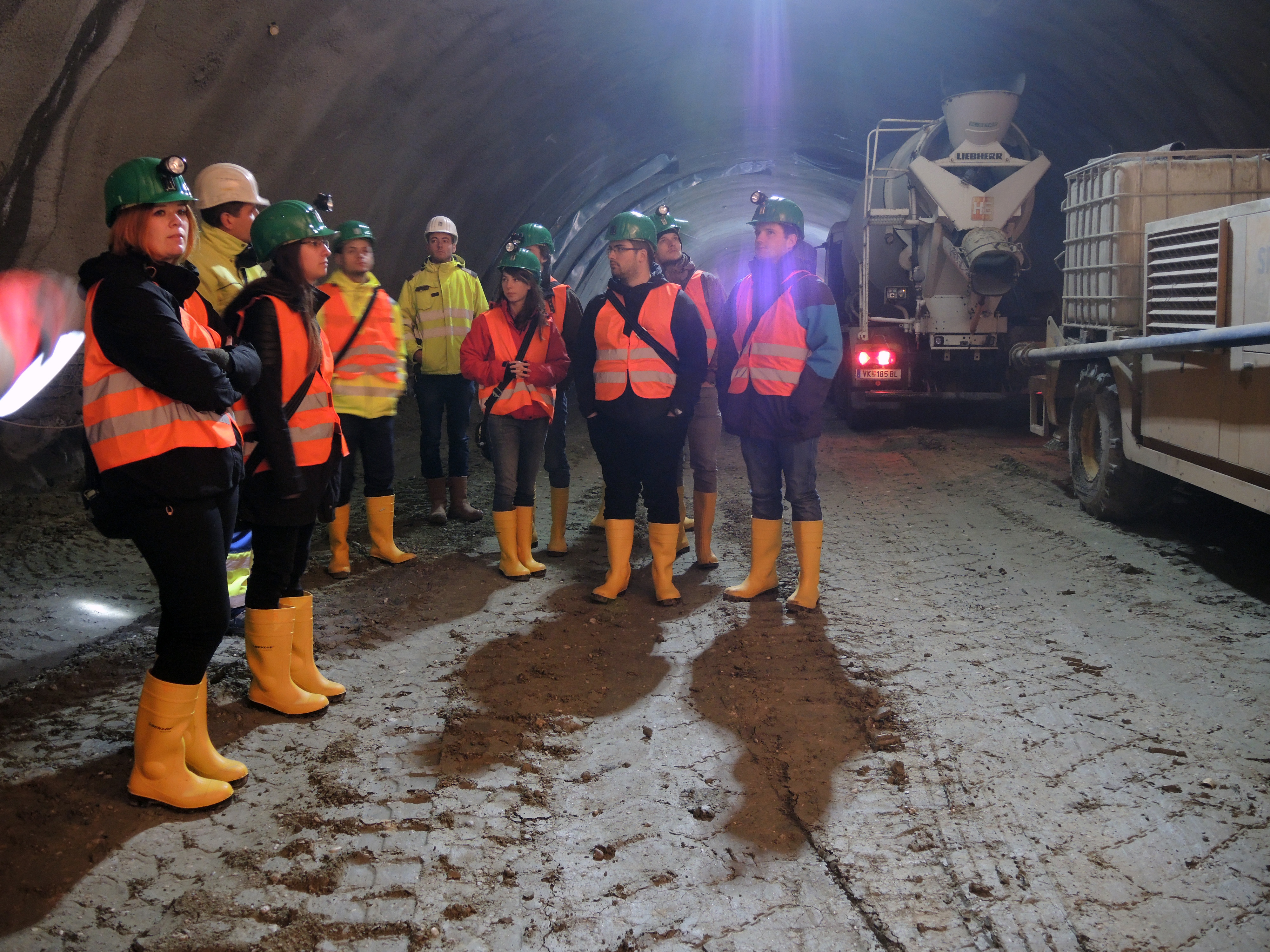 Students of the course Engineering Geodesy visit the tunnel construction sites of the Semmering Base Tunnel (SBT). The students examine the intermediate construction sites Sommerau and Göstritz above ground and go also underground using one of the two 100 m deep shafts at Sommerau to access the two tunnel tubes which are currently being built using the New Austrian Tunneling Method (NATM). In course of the excursions the students experience live several monitoring installations using total stations and fibre optic sensors.