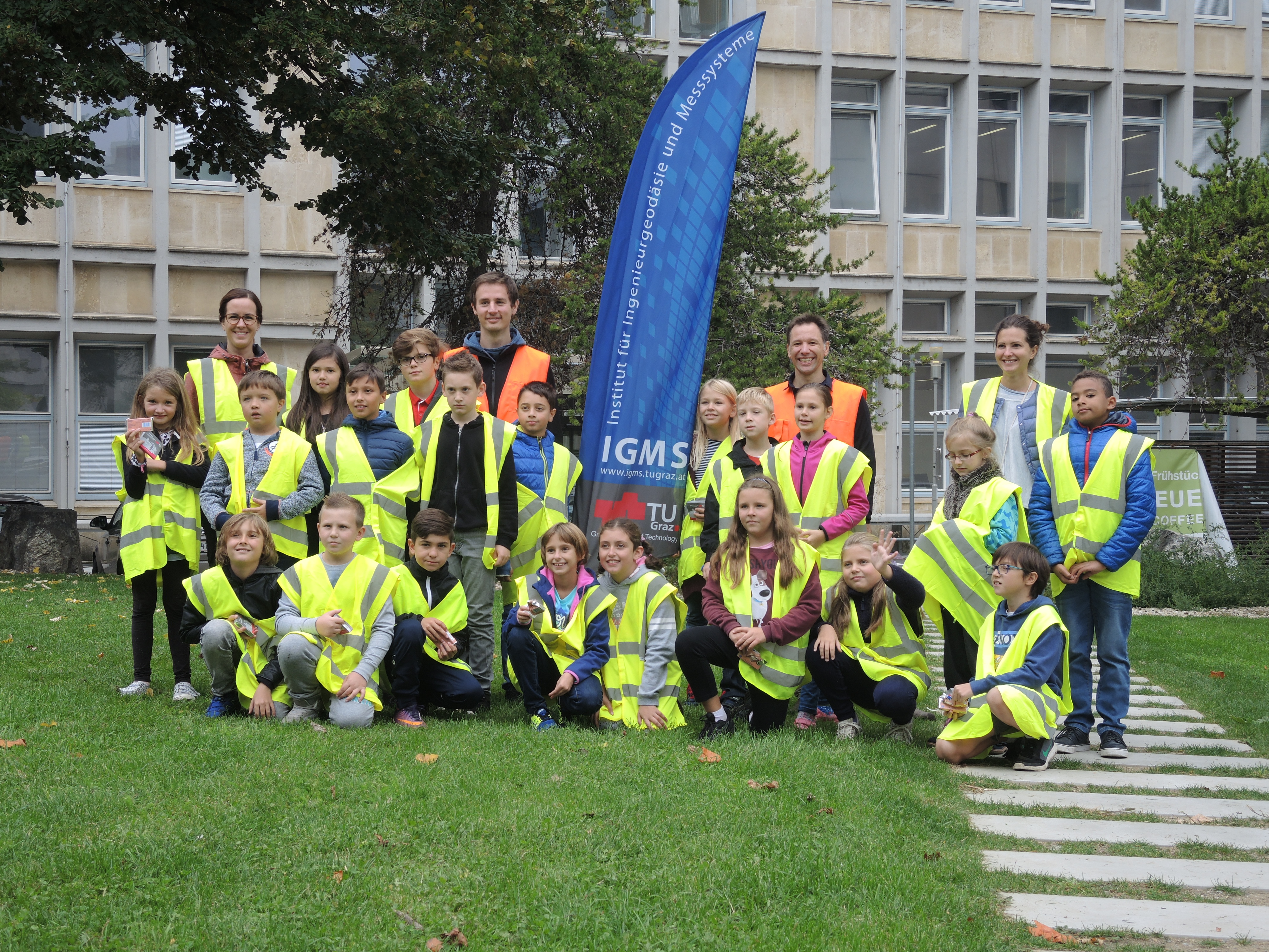On September 25th, KinderUniGraz visited IGMS. Pupils from a 4th grade elementary school (Volksschule Premstätten) learned about the principles of surveying and went on a treasure hunt with total stations.01.08.2017
