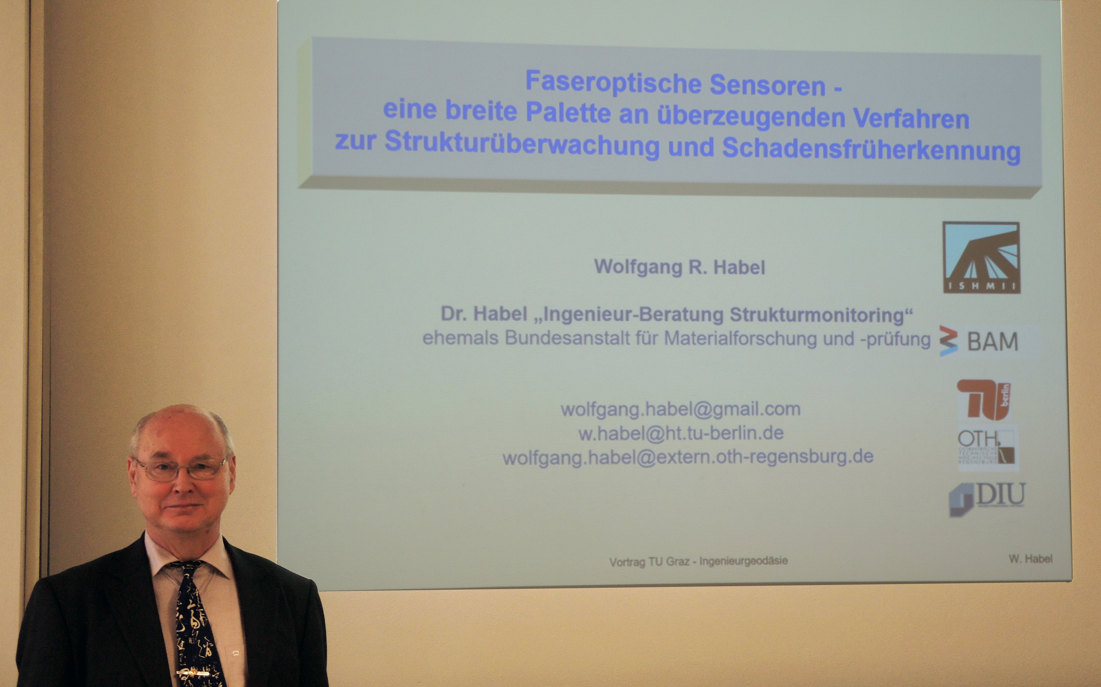 Former ISHMII President and Secretary General Dr. Wolfgang Habel visits IGMS and gives an invited talk for students at Graz University of Technology. In his presentation, Dr. Habel demonstrates the benefits of fibre optic sensors for Structural Health Monitoring (SHM).