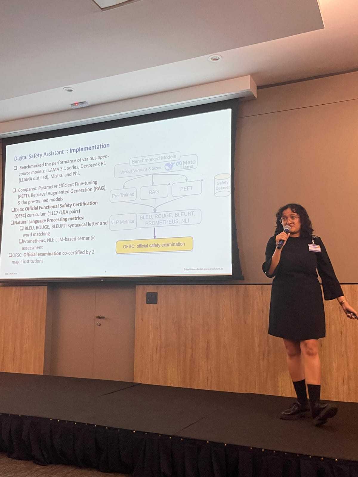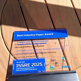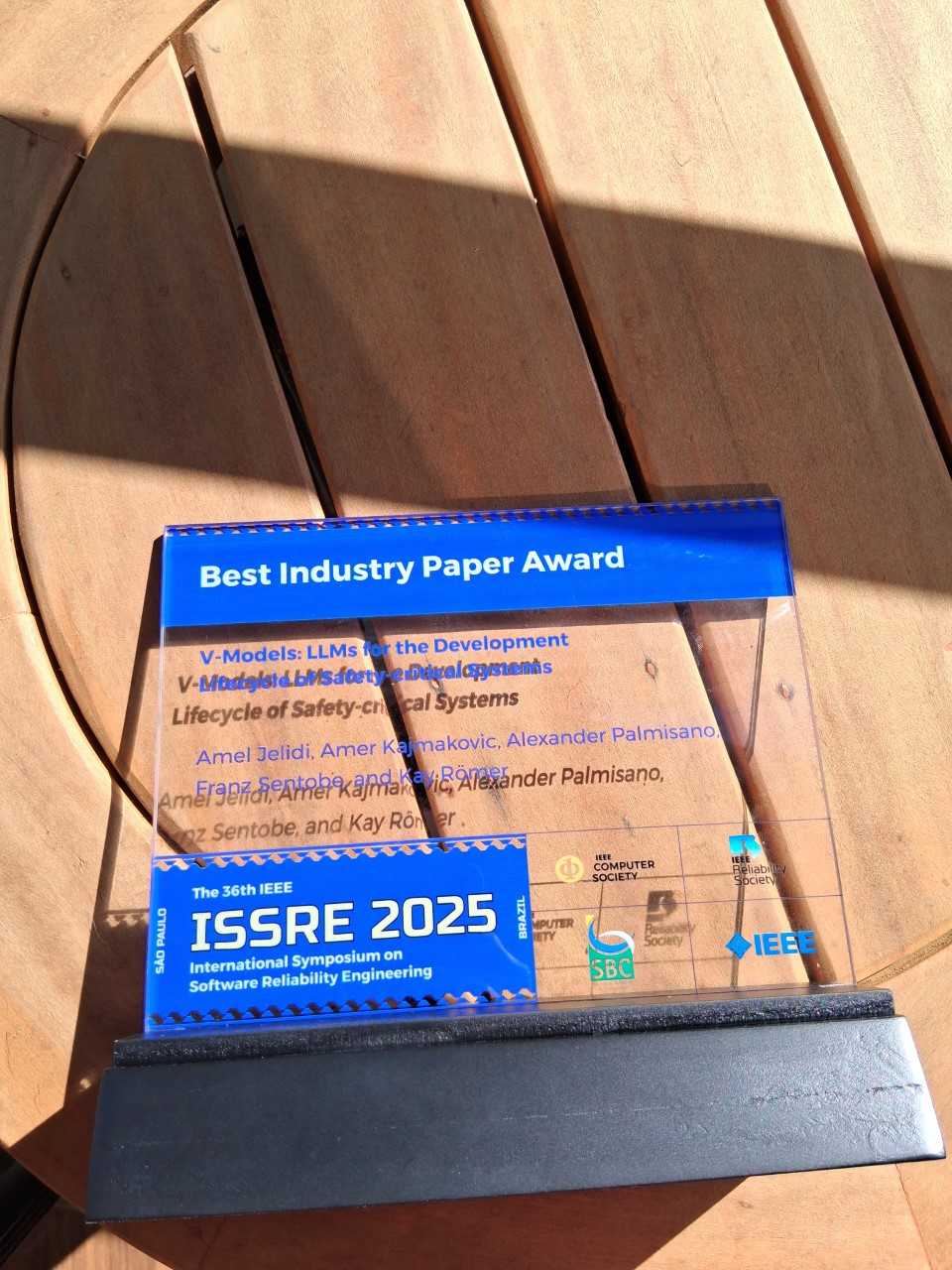 We are proud to announce that Amel Jelidi - researcher at Pro2Future and PhD student at Institute of Technical Informatics was recently awarded the “Best Industry Paper Award” for her paper titled “V-Models: LLMs for Development Lifecycle of Safety-Critical Systems” at the 36th IEEE International Symposium on Software Reliability Engineering (ISSRE).