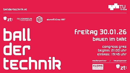 Der Ball der Technik findet am 30. Jänner 2026 im Grazer Congress statt – diesmal unter dem Motto „Bauen im Takt". Freuen Sie sich auf ein abwechslungsreiches Programm und eine spannende Ausstellung, bei der die Institute der Fakultäten für Architektur und Bauingenieurwissenschaften der TU Graz sowie das Institut für Architektur und Bauingenieurwesen der FH Joanneum ihre neuesten Forschungsergebnisse präsentieren werden.