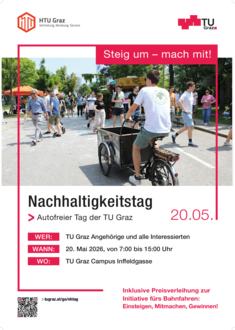 Ein besonderes Highlight ist diesmal die Preisverleihung der Initiative „Einsteigen, Mitmachen, Gewinnen“, die die TU Graz in Kooperation mit den ÖBB für ihre Bediensteten durchgeführt hat. Sie findet um 13:00 Uhr auf der Hauptbühne statt. Im Anschluss werden dort unter Studierenden Preise verlost; Hauptpreis ist ein TU Graz Fahrrad-Gutschein.