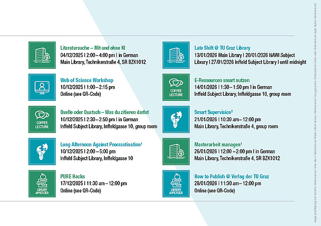 TU Graz Library offers events for students and researchers in a variety of formats. The current event flyer is available at all library branches and can also be downloaded.