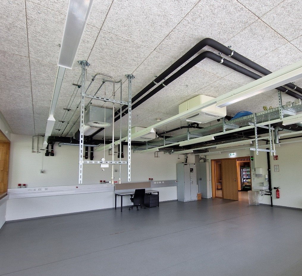 Der Laborraum befindet sich im Erdgeschoss und bietet eine moderne, vielseitig nutzbare Fläche für Forschung, technische Versuchsaufbauten, Schulungen oder Entwicklungsarbeiten.