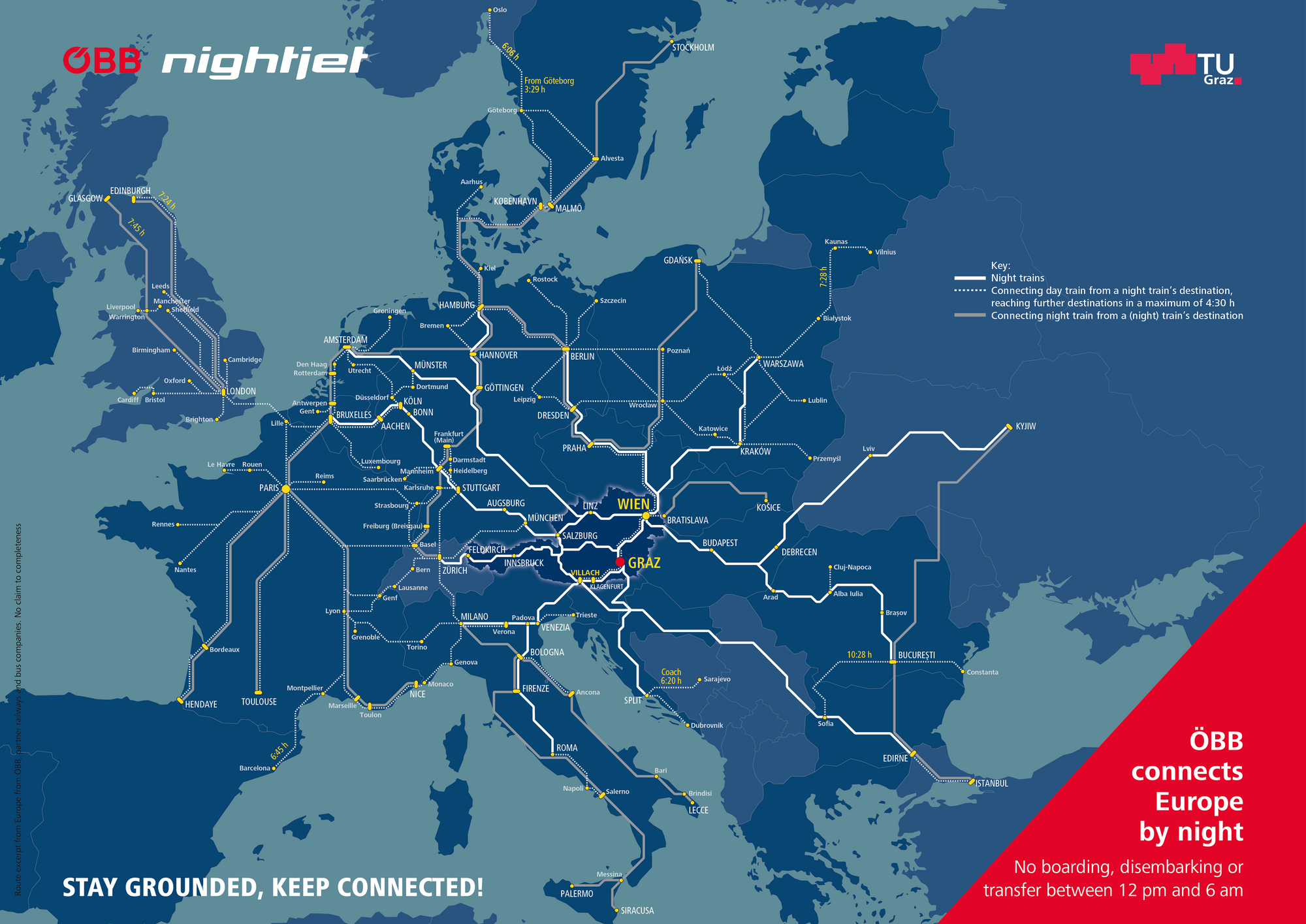 The use of trains, long-distance buses and overnight trains is subsidized by TU Graz in order to avoid short- and medium-haul flights as far as possible, and a climate protection charge was introduced on flights. The goal is to reduce CO2 emissions caused by air travel by TU Graz employees on business travel by 50 percent by 2030.