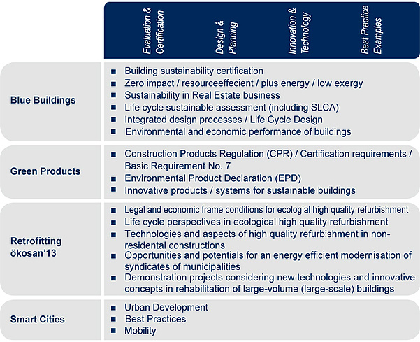 Den Schwerpunkt der Konferenz bildeten Vorträge zu den Themen "Blue Buildings" (Nachhaltige Gebäude), "Green Products" (Umweltfreundliche Produkte) sowie "Smart Cities". In Zusammenarbeit mit der seit Jahren stattfindenden Ökosan wurden mit der ökosan’13 entsprechende Schwerpunkte auf dem Gebiet der energieeffizienten und nachhaltigen Sanierung und Renovierung gesetzt. Neben den Vorträgen standen Posterpräsentationen, Fachausstellungen und eine Exkursion zu hochwertig energetisch sanierten Gebäuden auf dem Programm.