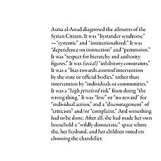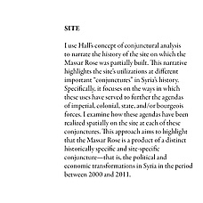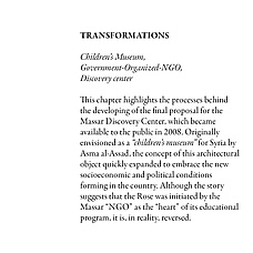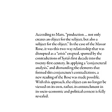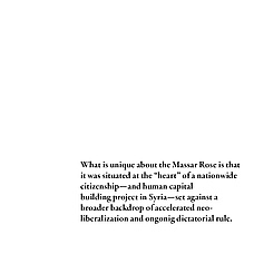 Vor dem Hintergrund eines allgemeinen Schweigens und einer Hemmung gegenüber dem, mit der First Lady assoziierten, Massar Discovery Center begann ich diese Arbeit. Diese Wahrnehmung führte zur Entwicklung eines interdisziplinären Forschungsansatzes, der sich auf feministische, marxistische und antikoloniale Forschungsmethoden stützt. Das Projekt zeichnet die Geschichte der Massar Rose von ihren Anfängen bis zum Ende ihrer langen Unterbrechung nach und zeigt ihre Verankerung in den sozioökonomischen und politischen Bedingungen auf, die zum Ausbruch der syrischen Revolution beitrugen.