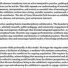 In einer Zeit, in der nationalistischer Geschichtsrevisionismus und institutionelle Vernachlässigung die öffentliche Erinnerung in der Region neu formen, plädiert die Arbeit für neue frameworks of care – solche, die Pluralität, kritische Auseinandersetzung und langfristige Verantwortung in den Vordergrund stellen. Sowohl ein Ort des Schreckens als auch ein Ort der Ehre ist Vraca kein isolierter Fall, sondern eine Linse, durch die wir neu darüber nachdenken können, wie wir uns mit einem schwierigem Erbe der Erinnerung in geteilten und ethnifizierten Gesellschaften auseinandersetzen.