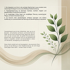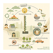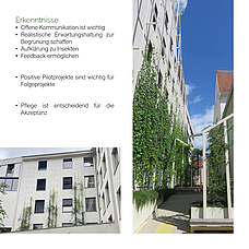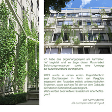 Neben einer ganzheitlichen Projektabwicklung und kontinuierlichen Pflege der Pflanzen bildet vor allem die Akzeptanz der Nutzer*innen eine wichtige Grundlage für langfristig erfolgreiche Begrünungsprojekte. Eine Nutzer*innenbefragung am konkreten Beispiel Karmeliterhof in Graz gibt Aufschluss über subjektive Wahrnehmungen und mögliche Vorurteile. Die Arbeit richtet sich sowohl an Fachleute aus Planung und Bauwesen und öffentliche Entscheidungsträger*innen als auch an interessierte Laien und bietet praxisnahe Unterstützung von der Projektidee bis zur Realisierung. Ziel ist es, durch eine verständliche und fundierte Aufarbeitung des Themas einen Beitrag zur Förderung begrünter Fassaden als integraler Bestandteil einer klimaangepassten und lebenswerten Stadtentwicklung zu leisten. Stellen Sie sich diese Masterarbeit wie einen umfassenden Wegweiser vor, der Ihnen nicht nur die malerischen Routen durch die grüne Stadt der Zukunft zeigt, sondern auch alle Brücken (Gesetzgebung, Technik) und Hindernisse (Brandschutz, Belichtung, Akzeptanz) auf diesem Weg präzise markiert, damit Sie sicher und erfolgreich ans Ziel gelangen.