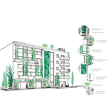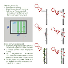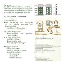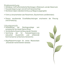 Das Projekt beleuchtet die Frage, wie vertikale Begrünungsmaßnahmen unter den spezifischen Rahmenbedingungen der steirischen Gesetzgebung erfolgreich geplant und umgesetzt werden können. In diesem Kontext lassen sich einige rechtliche und technische Herausforderungen erkennen, aufgrund derer vertiefende Recherchen zu Brandschutz sowie dem Umgang mit geforderten Belichtungsflächen für Innenräume angestellt und Belichtungsmessungen durchgeführt werden. Durch die gewonnenen Erkenntnisse können mögliche Lösungsansätze für beide Themenfelder erarbeitet werden.