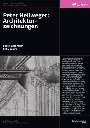 Das Vertiefungsmodul beschäftigt sich mit Architekturzeichnungen als zentralem Ausdrucksmittel des architektonischen Entwurfs, insbesondere mit Architekturzeichnungen von Peter Hellweger. Hellweger studierte in Graz Architektur und arbeitete an der TUG als Assistent bei Günther Domenig, sowie später in seinem eigenen Architekturbüro. Dabei entwickelte er einen besonderen Zeichenstil, der in zahlreichen Arbeiten fassbar wird. Sein Werk ist nahezu unbekannt geblieben – es sichtbar zu machen, ist die Intention dieses Moduls. Dazu stellen wir nach einer intensiven Auseinandersetzung mit Architekturzeichnungen eine Ausstellung von Arbeiten Peter Hellwegers zusammen.