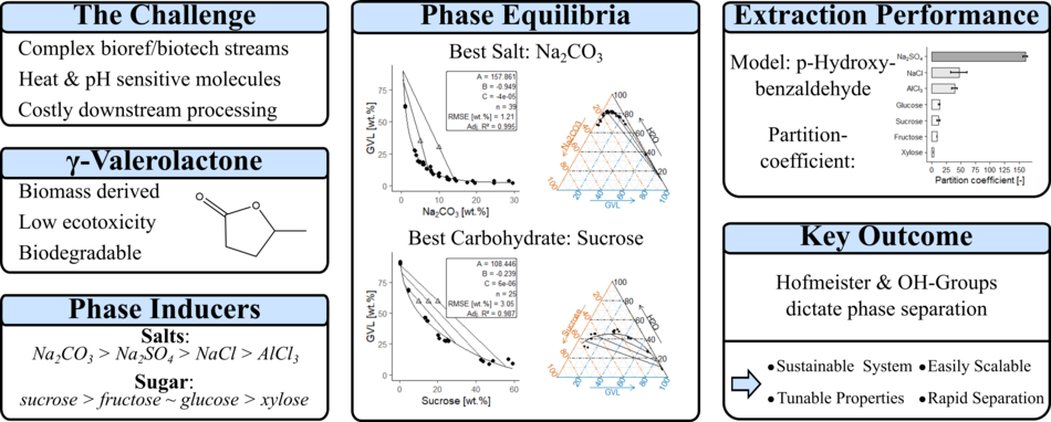 This work investigates aqueous two-phase systems involving γ-valerolactone (GVL)/water. GVL is a biomass derived, colorless cyclic ester, with low ecotoxicity and high biodegradability. The phase equilibria induced by four salts (NaCl, Na2SO4, Na2CO3, AlCl3) and four carbohydrates (xylose, glucose, fructose, sucrose) are described in XY and ternary diagrams. The salting out potential followed the order Na2CO3 > Na2SO4 > NaCl > AlCl3, which follows the order of the Hofmeister series. The sugaring-out potential followed the order sucrose > fructose ~ glucose > xylose, which correlated with the number of hydroxy groups. The ATPS were then applied to the liquid-liquid extraction of p-hydroxybenzaldehyde. At a mass ratio of 1:4:5 (salt:GVL:aqueous solution), and 2:4:4 (sugar:GVL:aqueous solution), p-hydroxybenzaldehyde partition coefficients of 161, 47, 39, were obtained with Na2SO4, NaCl, and AlCl3, respectively. Partition coefficients of 13, 12, 9, and 4 were obtained for glucose, sucrose, fructose, and xylose, respectively. The system containing Na2CO3 was not stable during liquid-liquid extraction.
