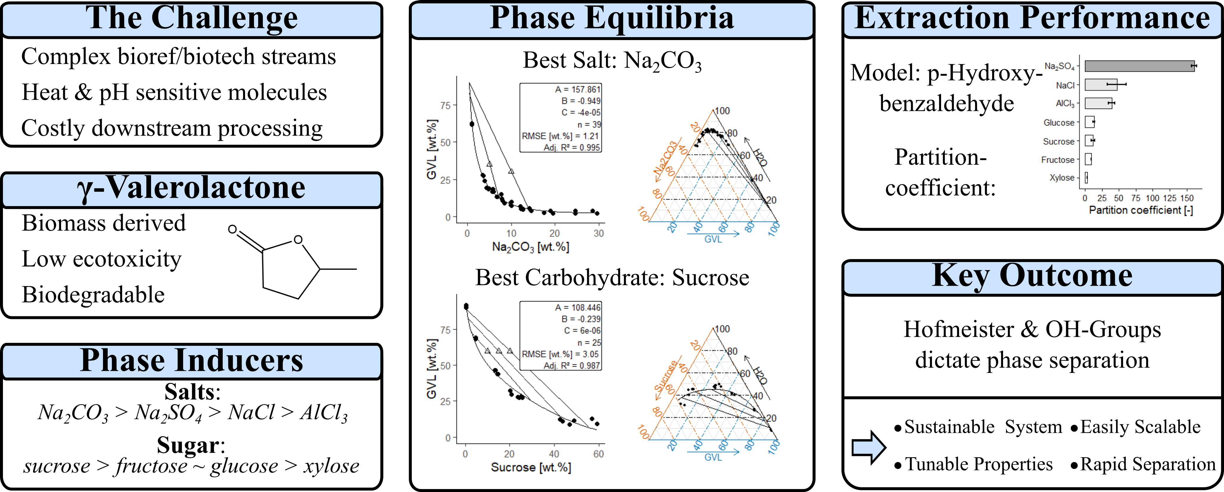 This paper demonstrates the ability of salts and carbohydrates to induce phase separation of the GVL/water system. The gentle and tunable nature of these ATPS provides a highly versatile, non-denaturing platform for industrial purification of a diverse range of complex biomolecules.