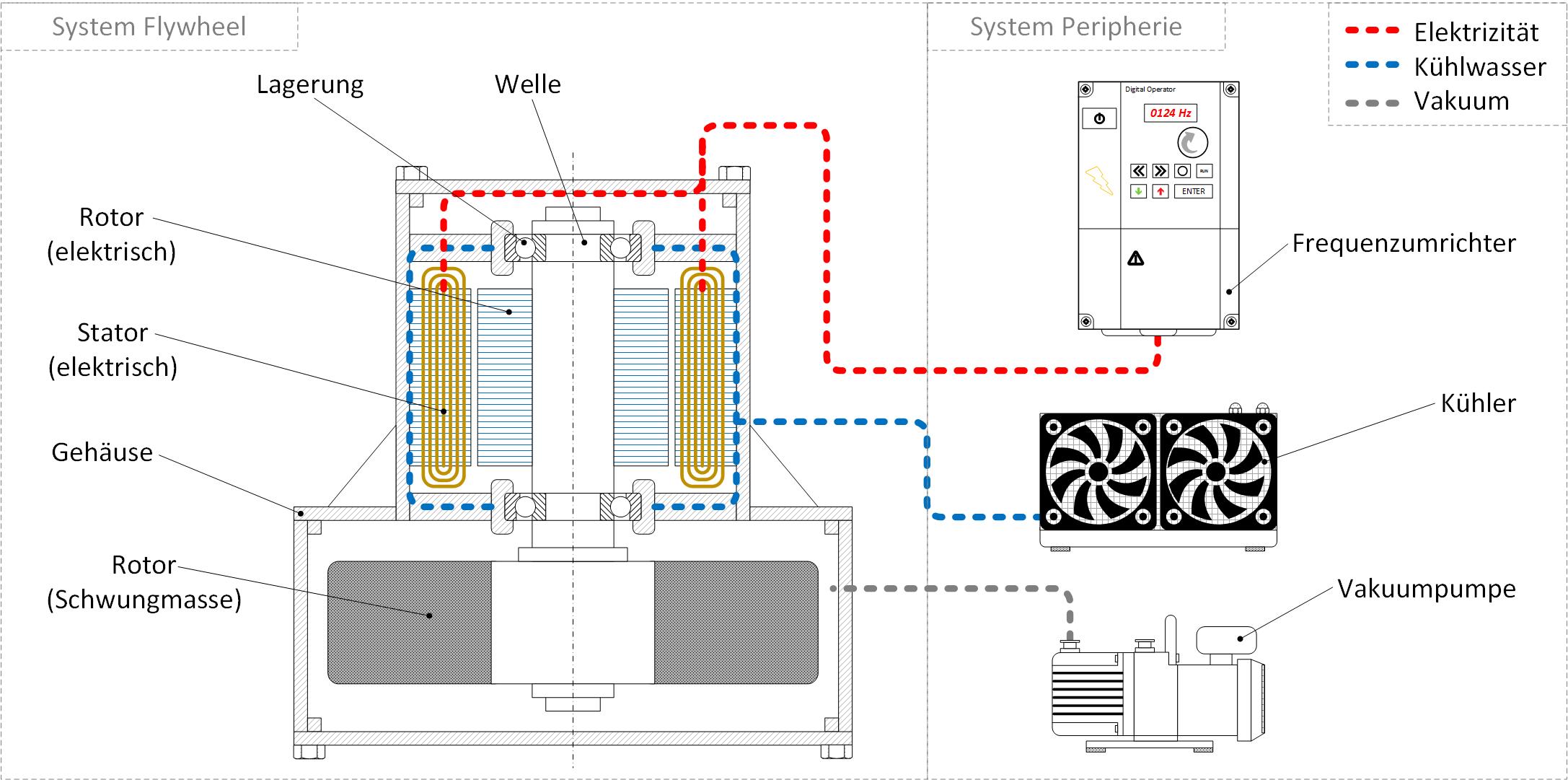 Seit 2011 beschäftigt sich das Elektrische Meßtechnik und Meßsignalverarbeitung mit dem Thema Flywheel Energy Storage Systems (FESS). Dabei handelt es sich um ein System zur Energiespeicherung – ähnlich wie Batterien und Akkus. Der Unterschied besteht darin, dass die Energie in Form von kinetischer Energie eines sich schnell drehenden Rotors gespeichert ist. Im Regelfall wird der Rotor durch einen Elektromotor beschleunigt (Energiespeicher wird geladen) bzw. verzögert (Energie wird aus dem Speicher entnommen). Es nimmt der Energieinhalt des Rotors mit dem Quadrat der Drehzahl zu, weshalb es im Zuge fortschreitender Optimierung die Systeme immer kompakter und schnelldrehender werden. Nachfolgende Abbildung zeigt den schematischen Aufbau unterschiedlicher FESS-Konzepte.