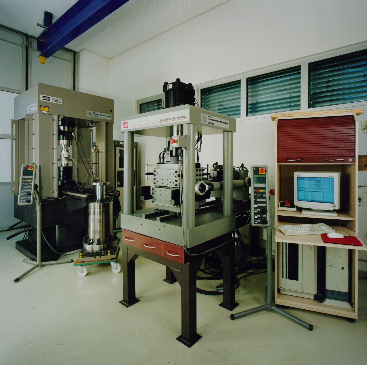 Compression tests on cylindrical specimens are conducted under confined and unconfined boundary conditions using testing equipment for uniaxial and triaxial compression tests. Direct shear tests on rock joints, discontinuities as well as intact rock specimens are performed under constant normal load as well as under constant normal stiffness conditions. A triaxial testing system especially designed for hydro-mechanical coupled tests on transition rock (soft rock / hard soil) is a core device in our pool of testing machines. Several smaller, portable testing devices such as a Schmidt Rebound Hammer, a point load device, an ultrasonic-pulse apparatus etc. complete our lab equipment.