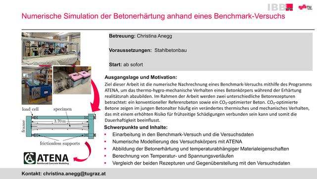 Das Institut für Betonbau betreut Abschlussarbeiten aus sämtlichen Gebieten des Stahlbetonbaus. Individuelle Themen können durch Abstimmung mit den Assistenten bzw. mit Prof. Schlicke vergeben werden. Wir bitte Sie sich bei Interesse an einer Masterarbeit am IBB einfach zu melden.