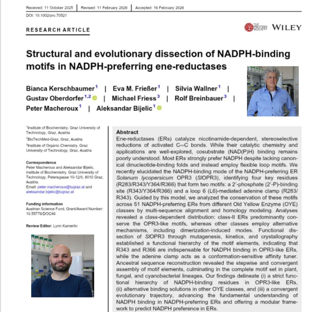 We are excited to share a new publication by our colleagues Aleksandar Bijelic and Peter Macheroux: “Structural and evolutionary dissection of NADPH-binding motifs in NADPH-preferring ene-reductases” (Wiley)