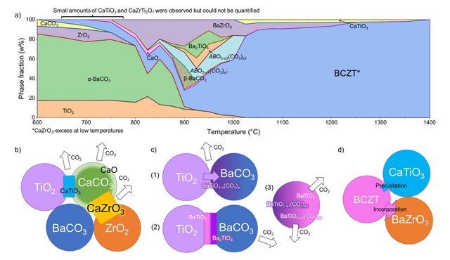 Continuous effort is focused on improving lead-free piezoelectric materials, including the piezoceramic (Ba,Ca)(Zr,Ti)O3. However, unwanted secondary phases may have unpredictable influence on the performance and decrease the reproducibility. In our latest study, we used in-situ X-ray diffraction and thermal analysis to investigate the solid-state phase formation sequence of (Ba,Ca)(Zr,Ti)O3. Based on the identified formation conditions of secondary phases (see figure below), process adaptations could be applied to not only increase the phase purity, but also enhance the piezoelectric performance. Unexpectedly, we also found a new intermediate phase that could change the view on the reaction mechanism. Read more in our recent publication in the Journal of the European Ceramic Society.