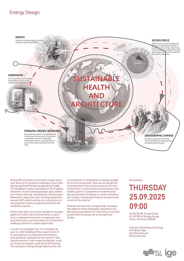 Um dies zu untersuchen, ist es notwendig, sich ein Bild von den Anforderungen an eine moderne Pflegeheimumgebung zu machen, wobei der Schwerpunkt auf den Bedürfnissen der „Heilenden Architektur” in Bezug auf Tageslicht, frische Luft, Zugang zum Freien und soziale Vernetzung liegt. In diesem Semester untersucht Energy Design die Rolle der Architektur bei der Gestaltung dieses Wandels, geleitet von der zentralen Frage: Ist es möglich, ein bestehendes ungenutztes Bürogebäude umzuwandeln, um sozial integrative Lebensumgebungen für ältere Menschen zu schaffen?
