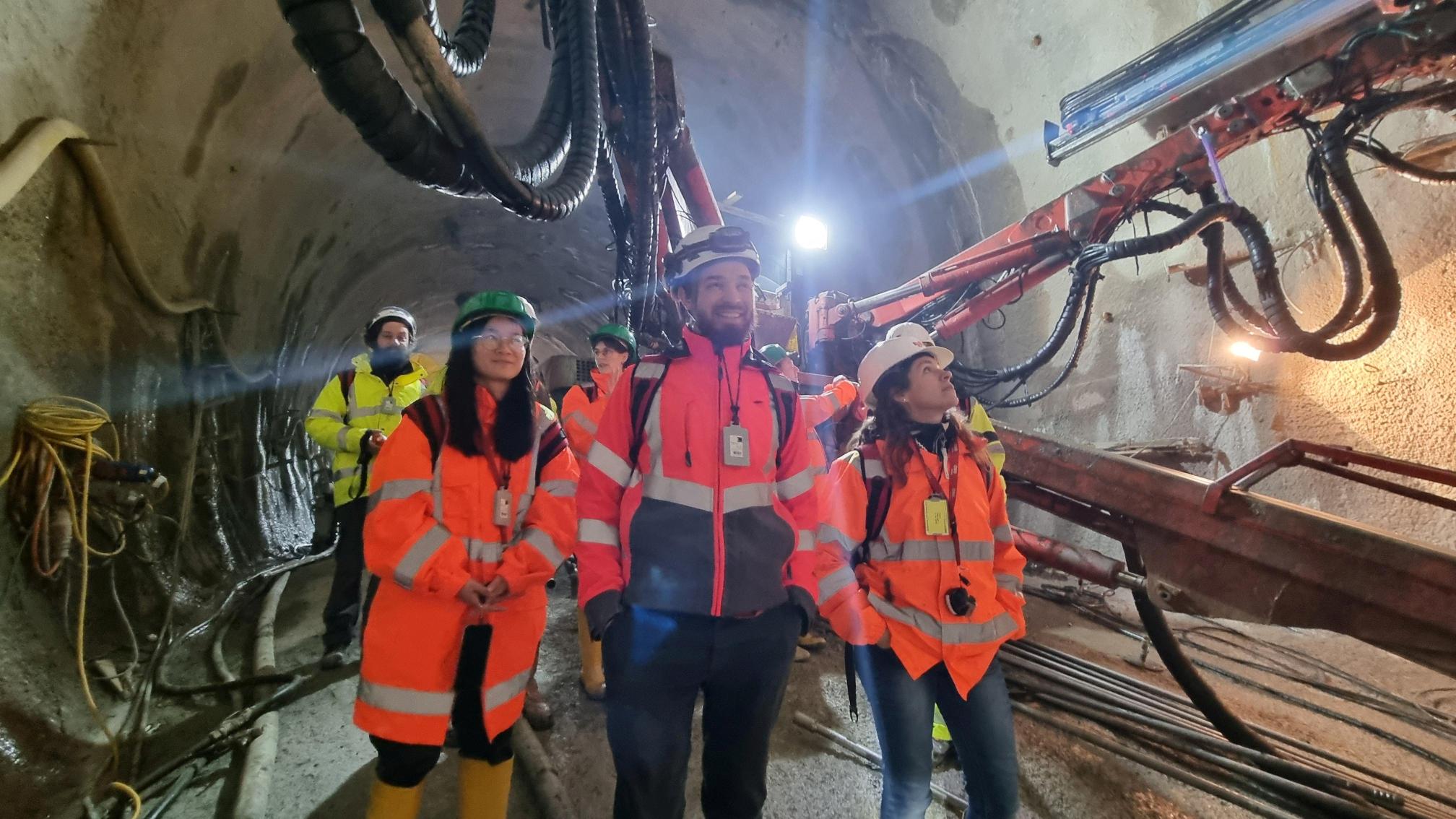 TU Graz students visit the tunnel construction sites Gloggnitz and Goestritz of the Semmering Base Tunnel. At Goestritz the tunnel tubes can only be accessed via a 285 m deep shaft. In front of the tunnel face students get informed about the challenges of geotechnical monitoring and the importance of geodetic measurements.