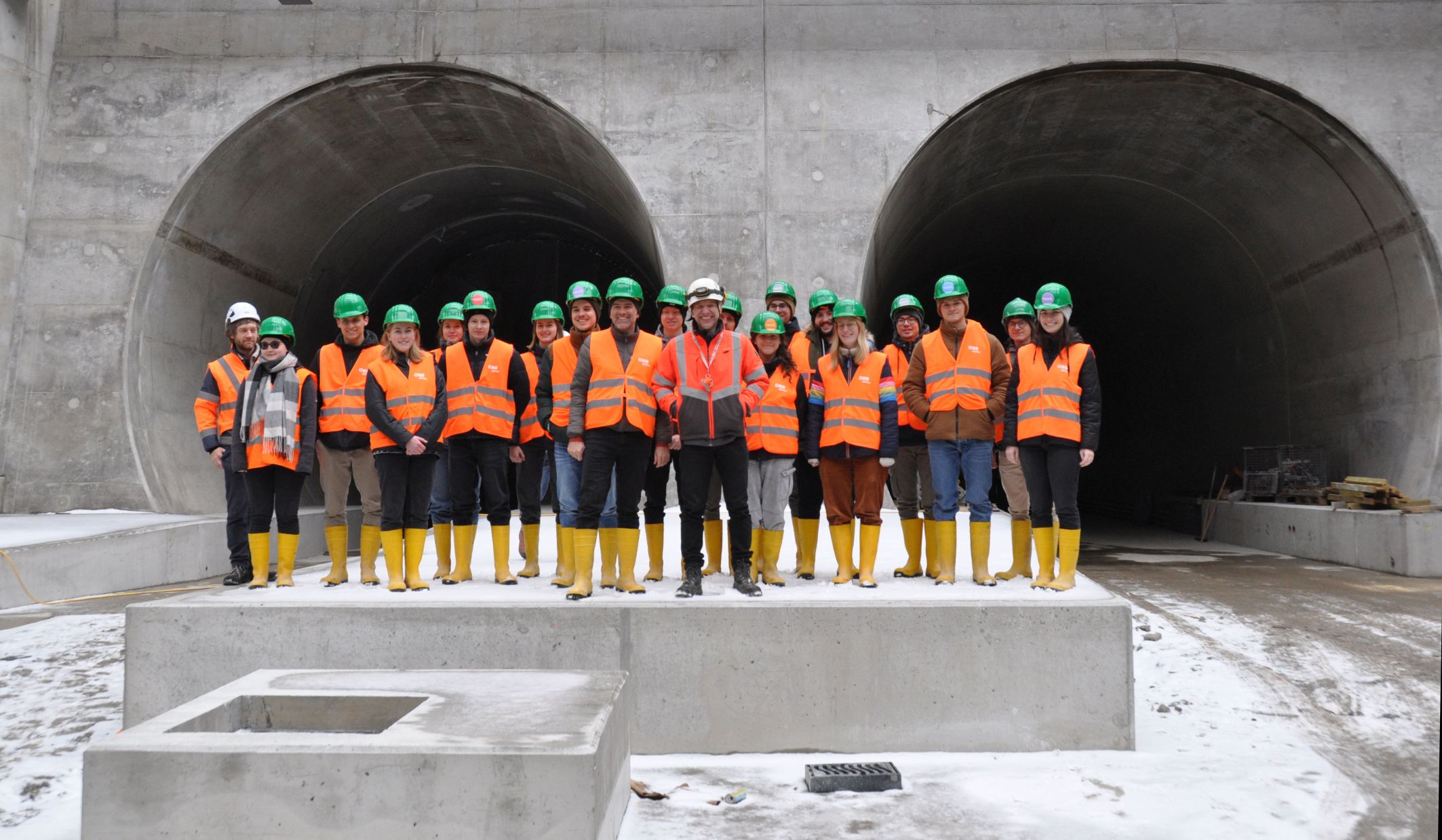 Our students had the great opportunity to experience tunnel construction live at the Semmering Base Tunnel. Only about 500 m of length are missing of this challenging 27.3 km long double tube railway tunnel. We want to thank Johannes Fleckl of the Austrian Railway company ÖBB for the insights into the project and Christoph Meyer from Geodata for the details on the tunnel direction control with geodetic gyros.