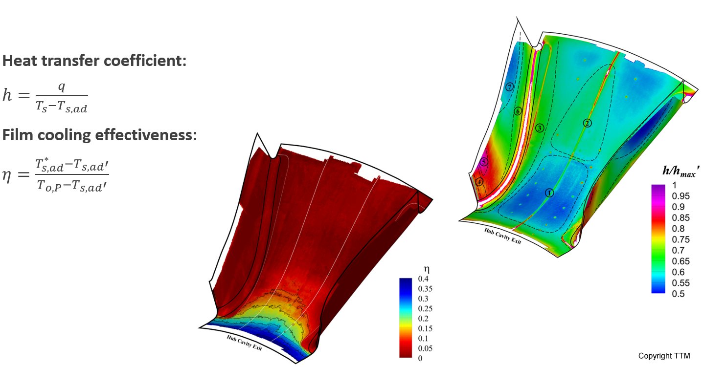 The institute uses high-sensitivity thermographic cameras not only for contract work, but also for EU projects with the aviation industry. The image shows the results of recording heat transfer coefficients and film cooling effectiveness.