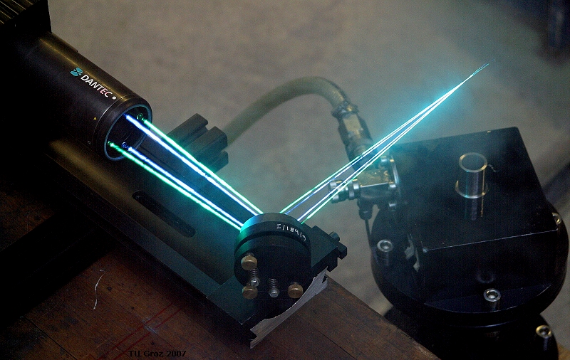 This technique involves adding small tracer particles with a diameter below 1 micrometre (e.g. oil) to the flow. These particles scatter light from two laser beams that are projected into a small measurement volume. In this volume, the laser beams interfere with each other to produce interference planes (tiny planes of light, one behind the other). As the particles fly through these planes, they reflect the light, and the frequency of these light flashes can be used to calculate the velocity if the distance between the interference planes is known. For our work, we use a two-component LDV system, which is commercially available, in collaboration with four other institutes at the Faculty of Mechanical Engineering. A small one-component LDV system is used for students' laboratory and outdoor measurements. The following picture shows the two-component LDV setup.
