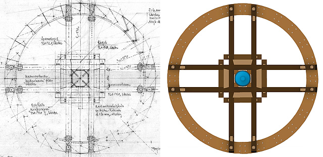 Im Zuge der Umsetzung wurden mehrere Hundert einzelne Holzkomponenten hergestellt und verbaut, darunter ca. 300 hölzerne Schrauben aus Eiche, zahlreiche Felgen aus Lärche und natürlich die, zimmermannsmäßig verbundenen Rad-Arme, welche ebenso aus heimischer Lärche gefertigt wurden. Hinter der Ausführung dieses Projekts stecken natürlich nicht nur zahlreiche intensive und teils auch abendliche Arbeitsstunden in der Werkstätte, sondern auch eine genaue vorausgehende Planung und Vorbereitung, die von Prof. Schickhofer und dem studentischen Mitarbeiter Stefan Leiz, übernommen wurde.