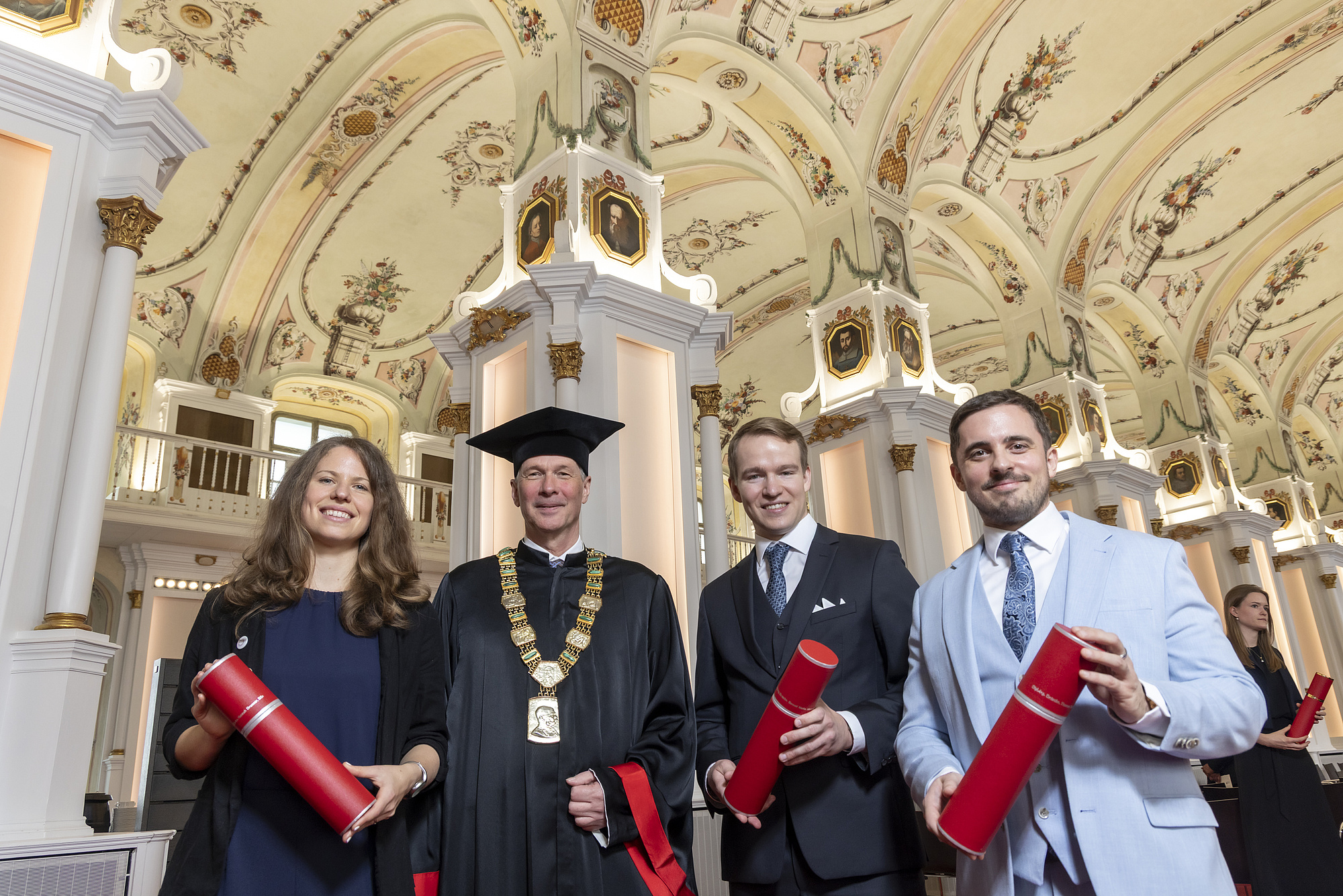Stellvertretend für den österreichischen Bundespräsidenten vollzogen Uni-Graz-Rektor Peter Riedler und TU Graz-Rektor Horst Bischof den Promotionsakt in der Aula der Alten Universität Graz. Am 18. März bekommen die Kandidat:innen Hannah Brunner, Samuel Hörmann und Thomas Steiner (TU Graz) sowie Christian Bundschuh, Peter Hartmann und Lena Parigger (Uni Graz) den Ehrenring in der Wiener Hofburg überreicht – persönlich von Bundespräsident Alexander Van der Bellen.