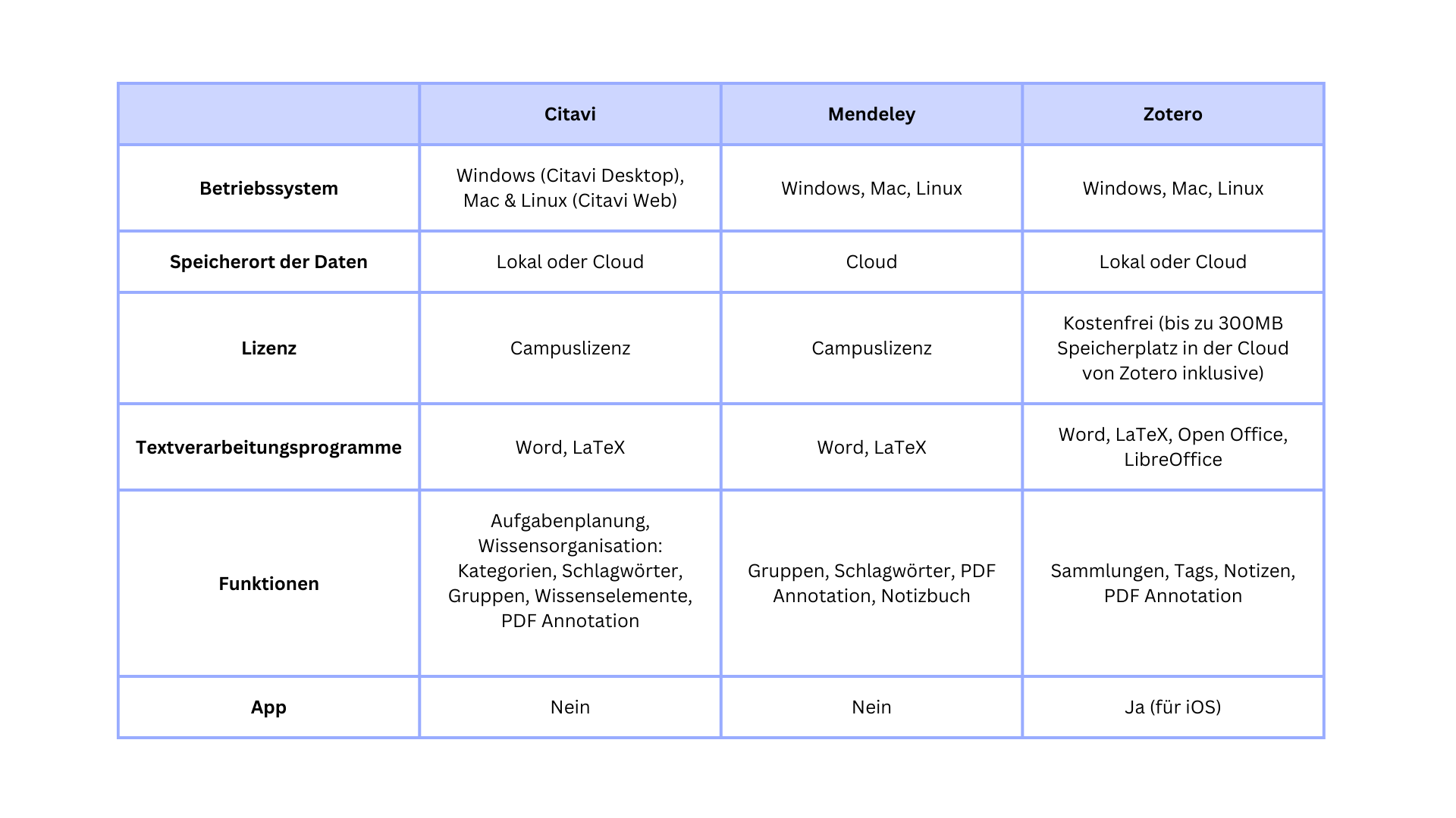 Grundsätzlich bieten alle drei Programme ähnliche Grundfunktionen. Sie können mit jedem Programm Literaturdatenbanken anlegen, Inhalte aus dem Internet über Browser-Erweiterungen oder PDFs importieren sowie Zitate und Literaturverzeichnisse in einem Textverarbeitungsprogramm erstellen. Dennoch gibt es einige wichtige Unterschiede, die es zu beachten gilt.