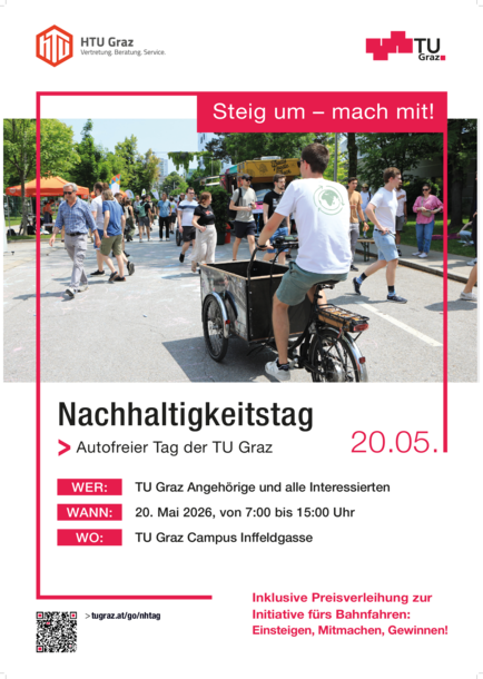 Ein besonderes Highlight ist diesmal die Preisverleihung der Initiative „Einsteigen, Mitmachen, Gewinnen“, die die TU Graz in Kooperation mit den ÖBB für ihre Bediensteten durchgeführt hat. Sie findet um 13:00 Uhr auf der Hauptbühne statt. Im Anschluss werden dort unter Studierenden Preise verlost; Hauptpreis ist ein TU Graz Fahrrad-Gutschein.