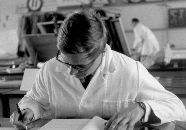 So fassten zwei Studenten den Entschluss, den leerstehenden Zeichensaal für ihre Kollegen „an Land zu ziehen“. Professor Federhofer wurde in einer seiner wöchentlichen Sprechstunden aufgesucht und das Anliegen einer strebsamen Studentenschar vorgebracht. Wir waren auf alles gefasst. Doch der weise alte Herr hörte uns aufmerksam an und sagte zu, sich unseren Wunsch überlegen zu wollen. In einer Woche sollten wir wieder kommen ….